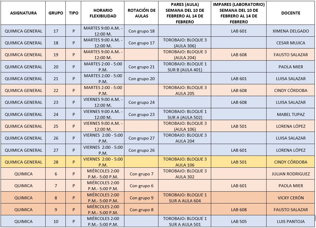 Recuerde que en la semana del 11 al 15 de agosto los grupos PARES inician en AULA y los IMPARES en LABORATORIO. De tal manera que se intercalan para hacer uso de las instalaciones de laboratorio semanalmente.