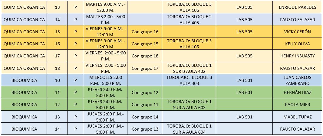 | BIOQUÍMICA | 13 | P | JUEVES 2:00 PM – 5:00 PM | Grupo 12 | L608 BLOQUE LABORATORIOS DE DOCENCIA TOROBAJO | FAUSTO SALAZAR |